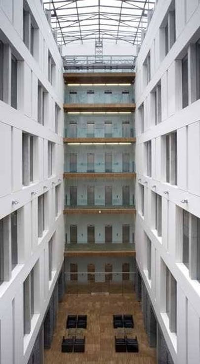 Het gebouw heeft een oud uiterlijk, maar wordt gekenmerkt door een modern interieur en de aanwezigheid van een enorm atrium dat de voor- en achtervleugel van het gebouw scheidt.