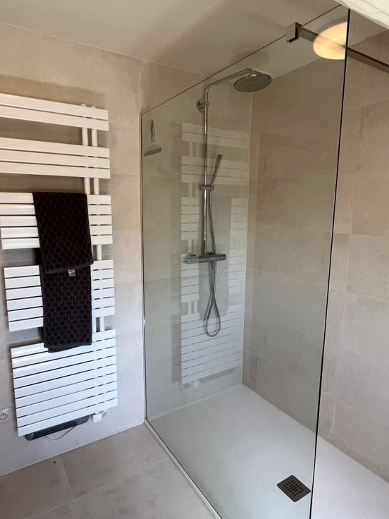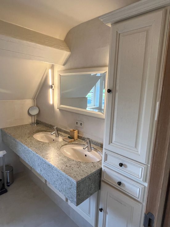 Op de verdieping vindt u 3 slaapkamers, een ruime badkamer met dubbele lavabo, inloopdouche en WC, een 2de sanitaire ruimte met lavabo en douchecel.