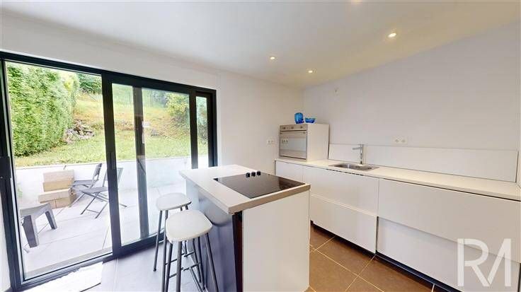 À l’étage, les pièces de vie lumineuses incluent un salon, une salle à manger, une cuisine semi-équipée, et une salle de bain avec accès direct à une terrasse et un magnifique jardin de 300 m².