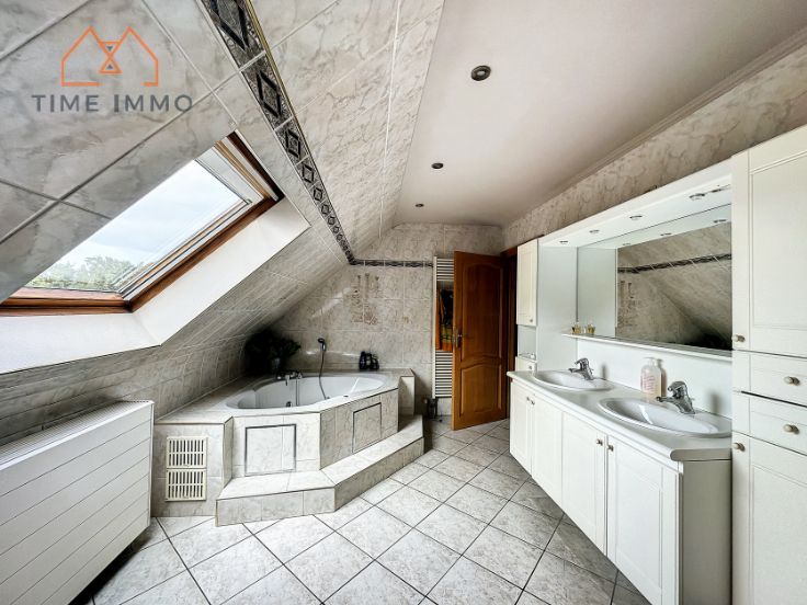 À l'étage, vous trouverez une vaste chambre avec accès à deux débarras/dressing, une salle de bain, une mezzanine, une buanderie, ainsi que deux autres chambres.