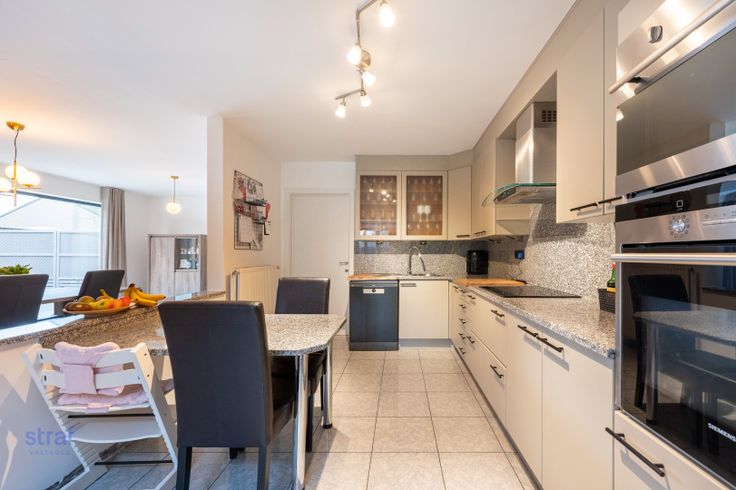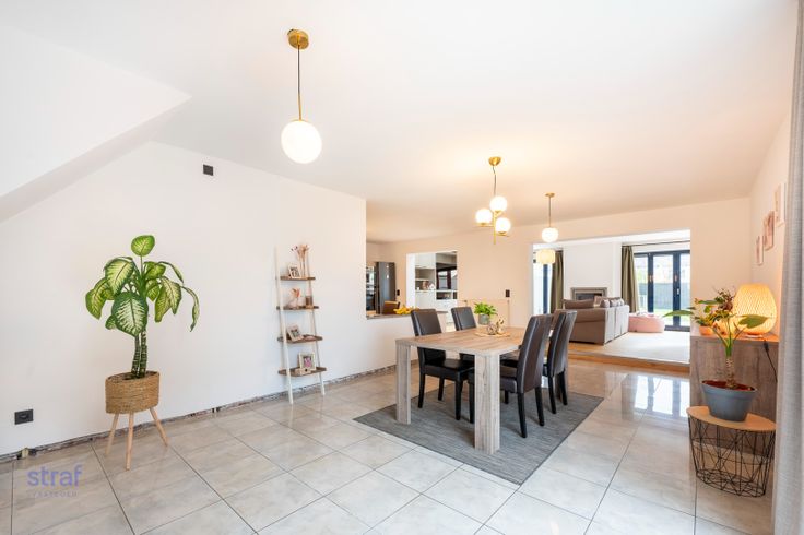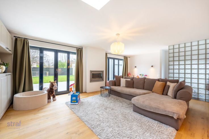 Deze grote woning heeft heel veel ruimte en licht. Eens binnen kom je via de inkomhal terecht in een lichtrijke woonkamer met grote ramen (en dakkoepel) én zicht op de grote tuin. Op het gelijkvloers is er ook een grote berging en een nog in te richten ruimte dat kan dienen als bureau of praktijkruimte.