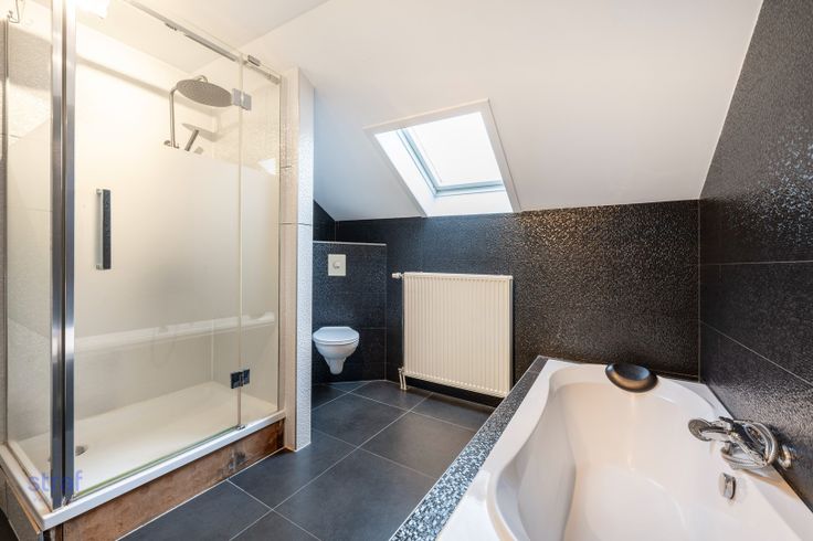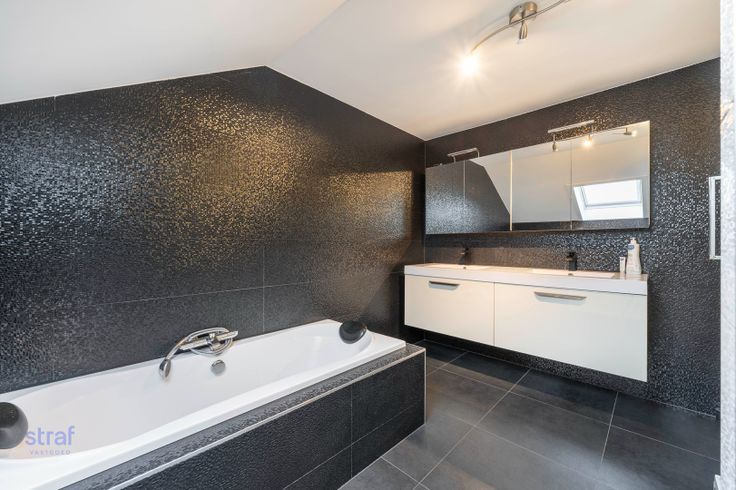 Boven vind je vier slaapkamers waarvan 1 met dressing. Aan de masterbedroom is ook een zonnig terras. De eyecatcher: de moderne, zwarte badkamer met dubbele lavabo, bad en afzonderlijk douche.