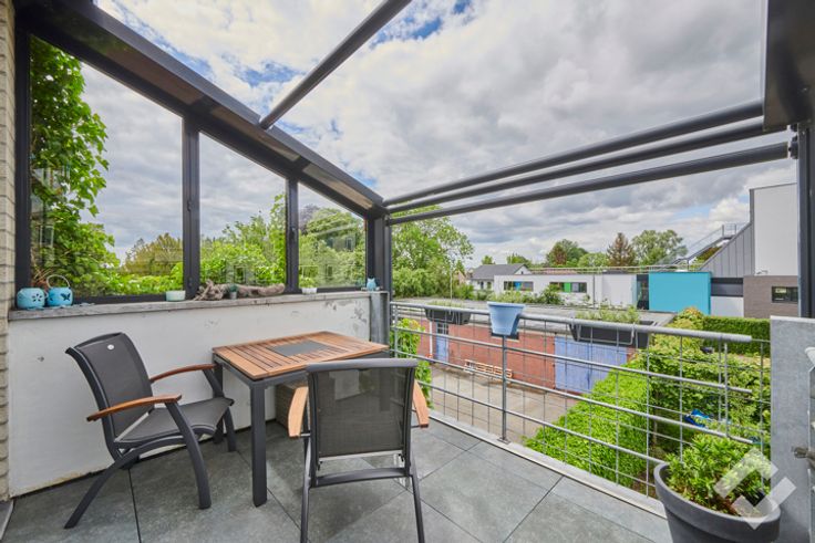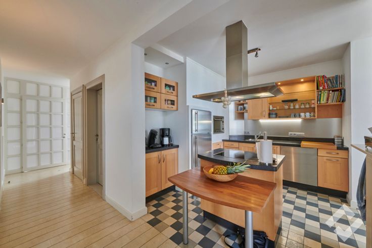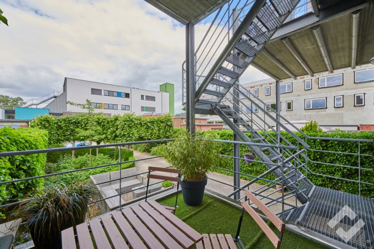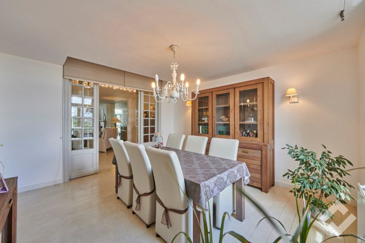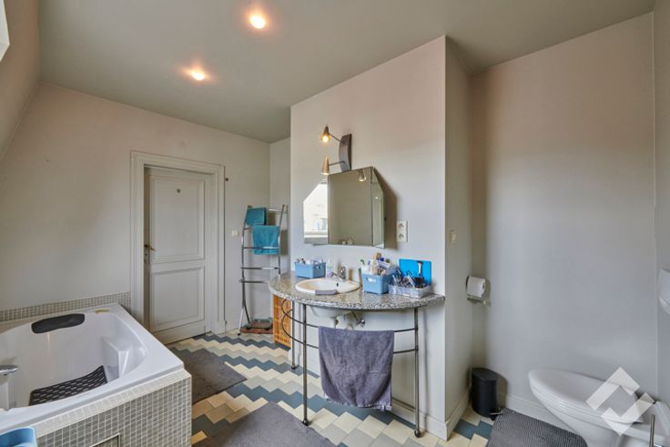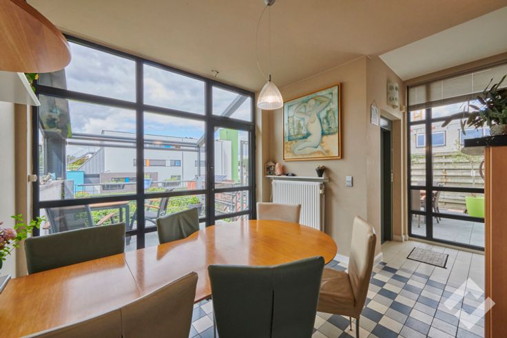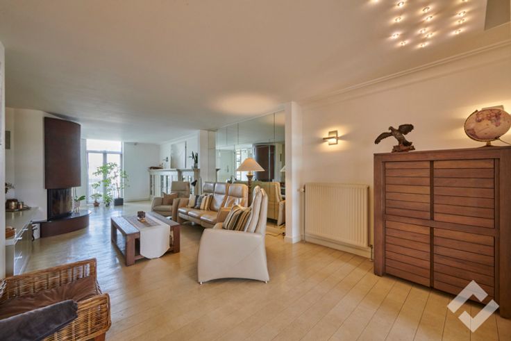 Op de eerste verdieping is er nog een zitruimte aanwezig met daarnaast een afgescheiden woongedeelte. Dit bestaat uit een zeer ruime leefruimte voorzien van een haard die overloopt naar een open keuken. Op deze verdieping zijn er ook nog 2 terrassen aanwezig.