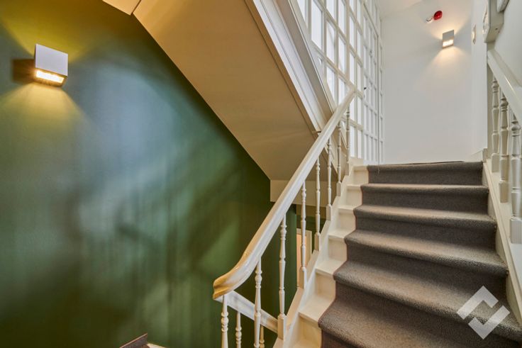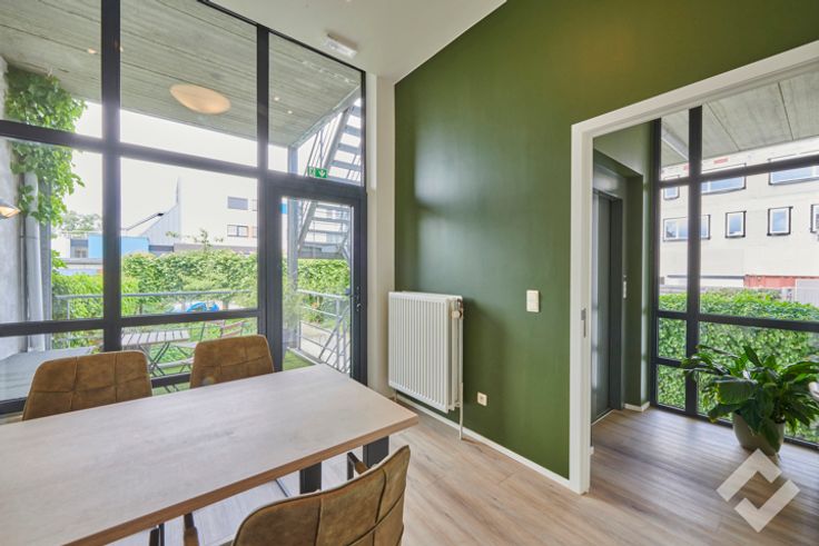 1ste verdieping: kantoor, keuken, living met haard, e