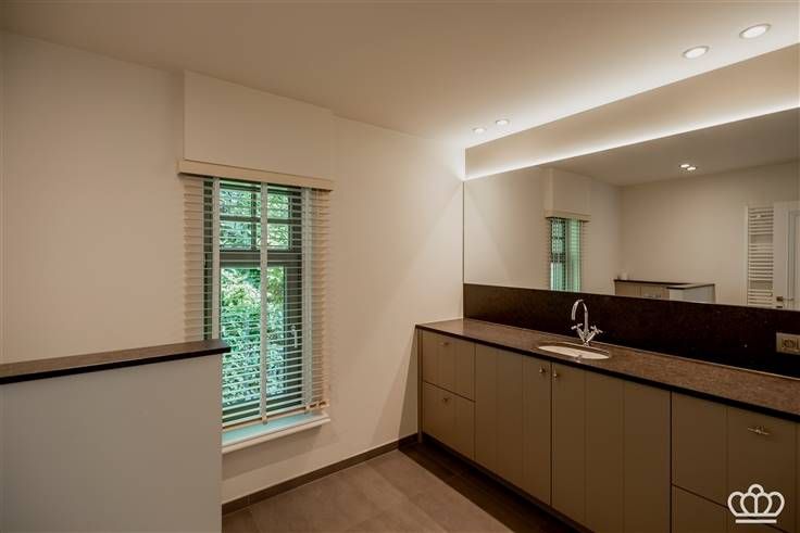 Groot kantoor met airco (mogelijkheid voor 2 kamers), ingebouwd bureel, veel kasten, keukentje met koelkast, lavabo en vaatwasser, toilet en technische ruimte met ventilatiesysteem.