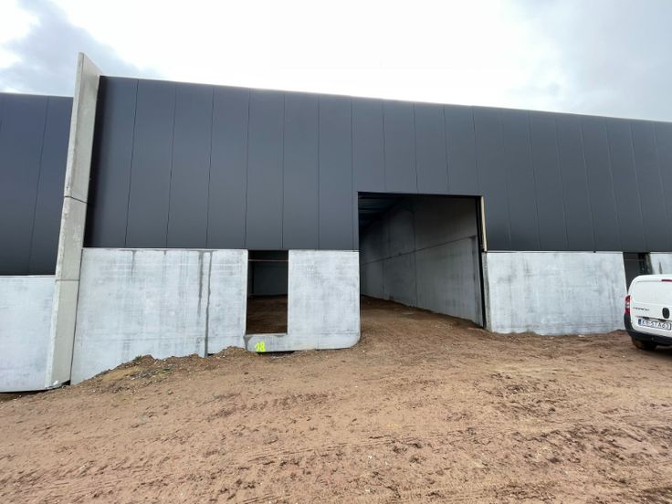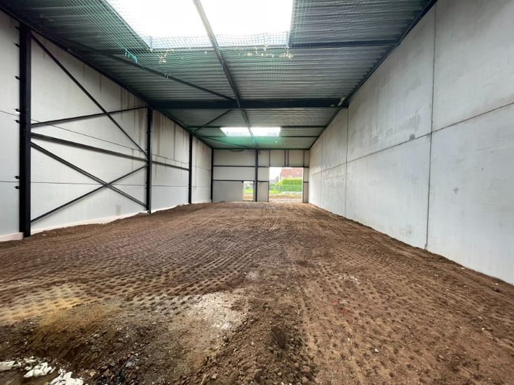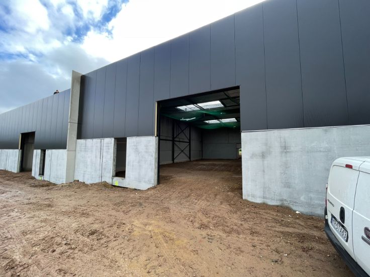 De magazijnen zelf zijn opgebouwd met een staalstructuur, betonnenplint en sandwichpanelen, 4 lichtstraten met rookluiken, polybetonvloer (2T/m²), afvoer sanitair, toegangsdeur + 2 automatische sectionaalpoorten (4m x 4m), LED verlichting en een aantal stopcontacten. Er is een opening (3m x 3m)gemaakt tussen beide units en kan afgesloten worden met een poort.