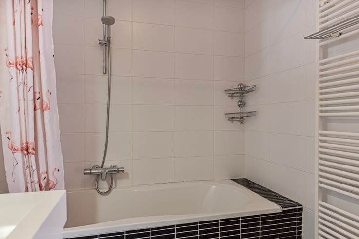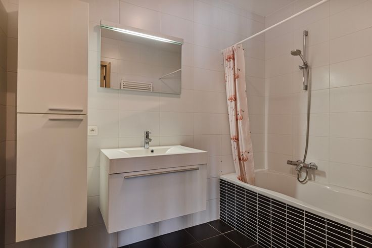 De volledig betegelde badkamer is voorzien van een ligbad met douchegordijn, wastafel met meubel, handdoekradiator en wandkast. Separaat van de badkamer bevindt zich een toiletruimte.