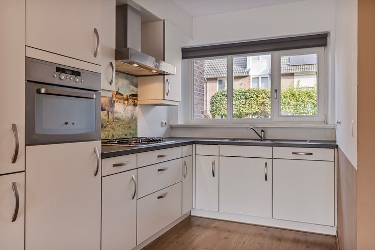 De open keuken is uitgevoerd in een hoekopstelling met diverse boven-en onderkasten. De keuken heeft een kunststof aanrechtblad, een 5-pits gaskookplaat, afzuigkap, enkele spoelbak, vaatwasser, combi oven en een koelkast.