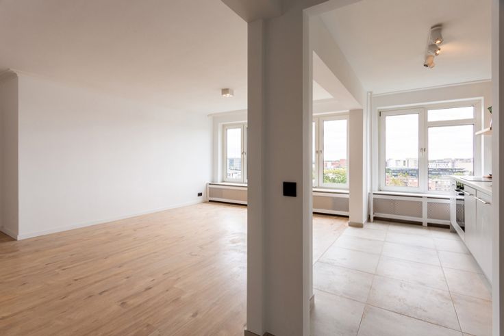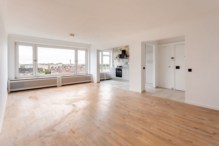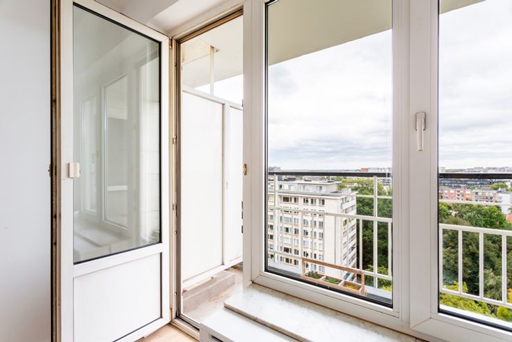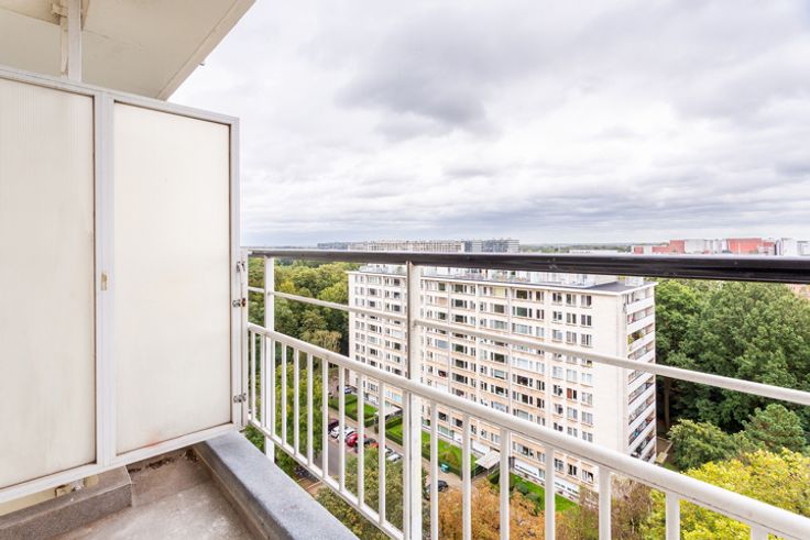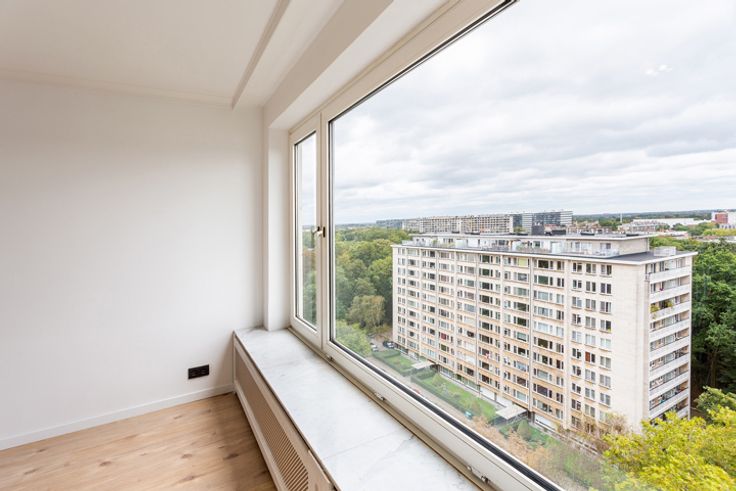 Instapklaar twee slaapkamer appartement op een groene residentiële locatie in Berchem. De Roest d'Alkemadelaan is een aangename omgeving op wandelafstand van supermarkten, winkels en openbaar vervoer. Het appartement is gelegen op de 13de verdieping van een zeer verzorgd gebouw. Indeling: inkom met ingemaakte wasruimte, mooie keuken met kookplaat, dampkap, ijskast, oven en vaatwasser, ruime woonkamer op laminaat, badkamer op lichtgrijze tegels met inloopdouche, badkamermeubel en kolomkast, apart toilet, en twee slaapkamers waarvan de grote met een aansluitend terras. Overal dubbel glas aanwezig. Elektrische keuring conform. Ondergrondse staanplaats optioneel aan 18.000 Euro.