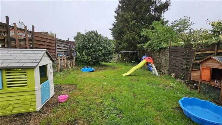 Rez: Pièce d'entrée, salle à manger, salle de douche, garage une voiture, bureau ou salon, sur l'arrière living avec cuisine intégrée, cour, jardin.