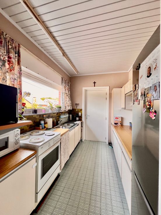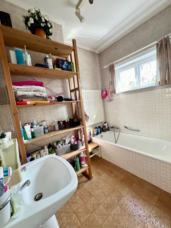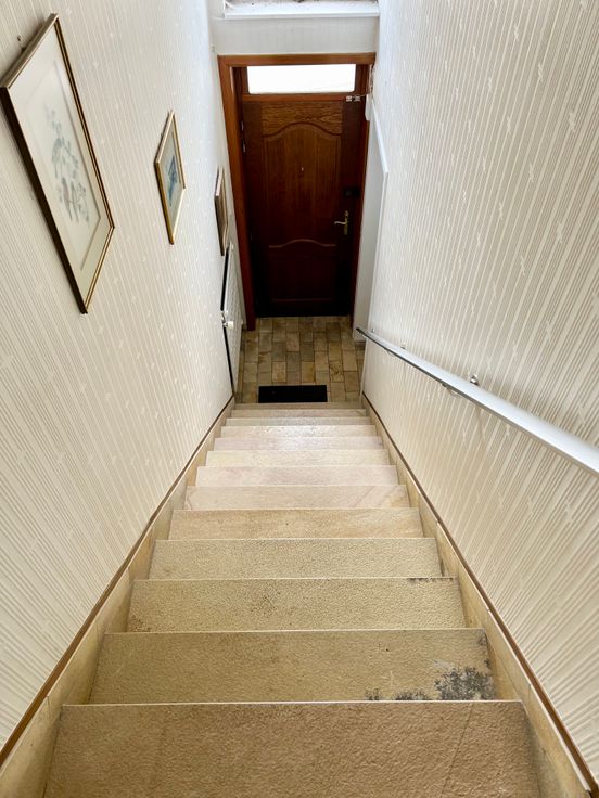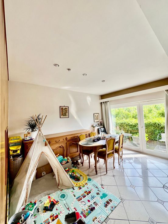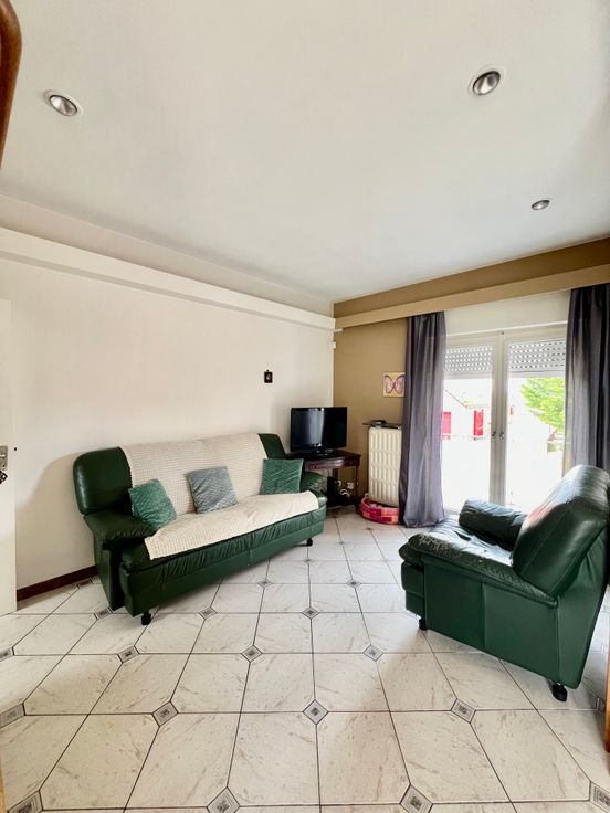 Au 1er: hall, séjour très lumineux donnant sur la cuisine, salle de bains, wc avec lave-mains, 2 chambres.