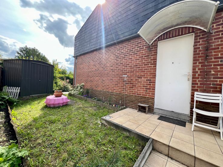 Jardinet entourant la maison. Espaces parking devant la maison.