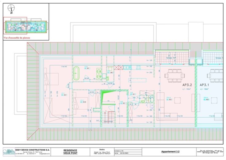 Au sein de la toute nouvelle construction « Résidence Vieux Pont » à Leuze dont la livraison est imminente, l’Agence immobilière Leclercq vous propose ce magnifique appartement 2 chambres de près de 150 m² au 3ème et dernier étage de la copropriété ! L’appartement se compose comme suit: Un ascenseur vous emmènera sur un palier commun où se trouve uniquement votre nid douillet. Ensuite, un hall d’entrée distribue un WC séparé ; une spacieuse buanderie et une grande cuisine équipée. Plus loin, vous trouverez un grand séjour traversant de plus de 42 m² baigné de lumière de part et d’autre. Ce dernier comprend également une belle terrasse idéalement orientée avec vue sur les jardins. Enfin, un hall de nuit distribue un WC ; une grande salle de bain ainsi que 2 superbes chambres dont une parentale 33 m². Caractéristiques techniques: - Possibilité de parking ou carport. - Chauffage au gaz avec chaudière à condensation individuelle. - Cuisine personnalisable directement chez le cuisiniste. - Ventilation simple flux. - Livraison de l’appartement achevé au 1er trimestre 2024. - Douche supplémentaire en supplément. Les petits plus selon l’agence immobilière Leclercq: - Isolation thermique à la pointe. - Possibilité d’ajouter une 3ème belle chambre. - Proximité directe avec la gare et différents commerces. N’attendez-plus pour convenir d’une visite ! Bien référencé 5757440 Vente sous régime T.V.A. – Loi Breyne Publicité à caractère non contractuel et ne constituant pas une offre.