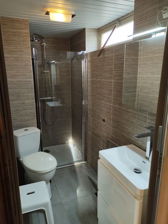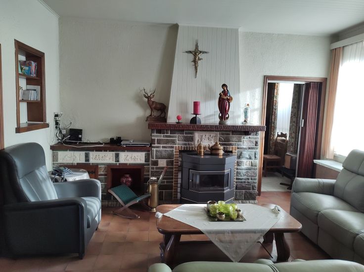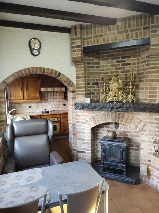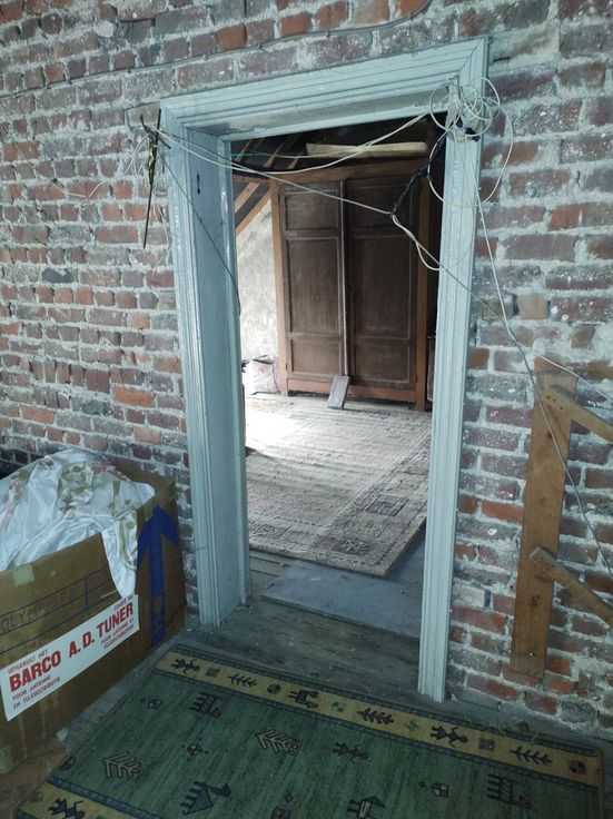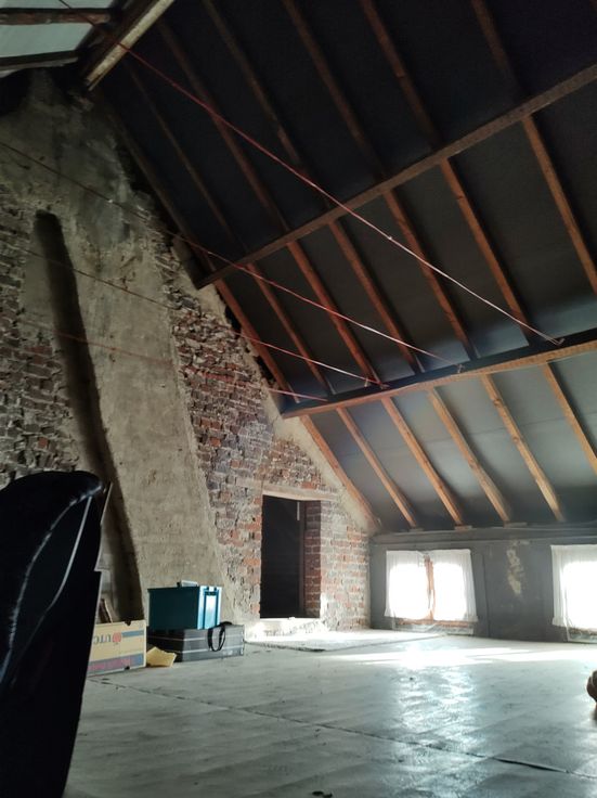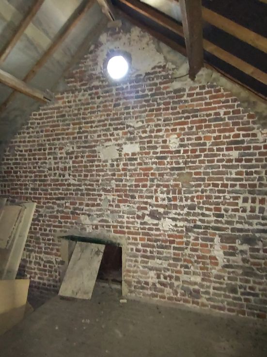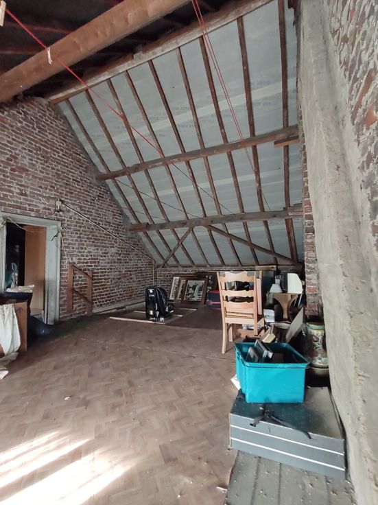Indeling van de woonst. Op het gelijkvloers vindt u de in 2 vertrekken opgesplitste leefruimte, met aansluitend de keuken, een trapje naar een verhoogde tussenruimte (kinderkamer/bureau) en de enige slaapkamer die in verbinding staat met een gerenoveerde badkamer en toilet. Via een vaste trap in de keuken met basisfaciliteiten kan u of de kelder betreden of bereikt u een bijzonder ruime niet-ingerichte zolderruimte, waar voldoende plaats is voor bijkomend 2 tot 3 slaapkamers.