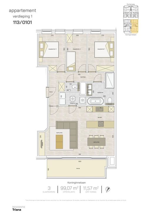 Modern nieuwbouwappartement op de eerste verdieping van de residentie Triana via ingang Koninginnelaan 113 in het centrum van Middelkerke, vlakbij tal van winkels en op enkele meters van de Zeedijk. Dit ruime appartement heeft een oppervlakte van 99m² en beschikt over 3 aangename slaapkamers, een ruime woonkamer, een badkamer met bad en douche, een berging en toilet. Ideaal voor comfortabel wonen of als investering! Geniet van het buitenleven op het ruime terras. Alle appartementen worden voorzien van vloerverwarming, aangedreven door een efficiënte lucht-water warmtepomp. Er is een fietsenberging aanwezig. De oplevering van dit hoogwaardig appartement staat gepland voor 2025, wat een unieke kans biedt om een gloednieuwe woning te verwerven op een centrale locatie. Ervaar modern wonen op zijn best met duurzame voorzieningen en alle geneugten van het stadsleven binnen handbereik. Contacteer ons kantoor voor meer informatie over dit appartement in deze gloednieuwe residentie! Renovatieplicht: onbekend