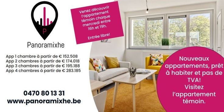 Appartements tous avec terrasse et avec 1, 2, 3 ou 4 chambres. Se situe dans un quartier en pleine expansion avec le nouvel arrêt de tram exactement devant la porte. Profitez des avantages d'un tout nouvel appartement (cuisine, sdb, carrelages, chauffages, élèctricité,... Tout est nouvel) sans payer de la TVA (uniquement des droits d'enregistrement/frais de notaire). N'hésitez pas à prendre contact pour plus d'information ou pour visiter l'appartement témoin. Plus d'information et l'offre complet sur www.panoramixhe.be.