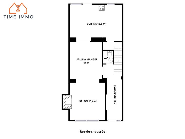 Rez-de-chaussée : Salon, salle à manger, cuisine, WC, hall d’entrée