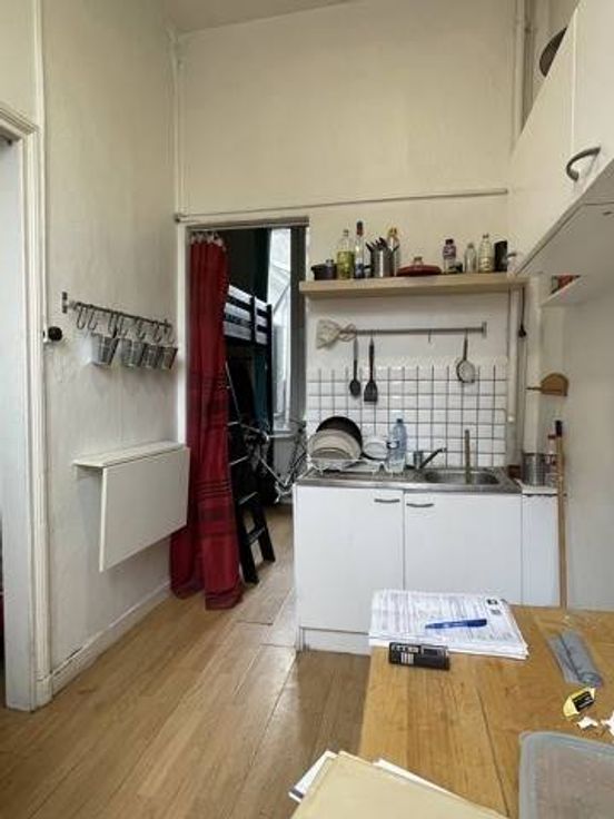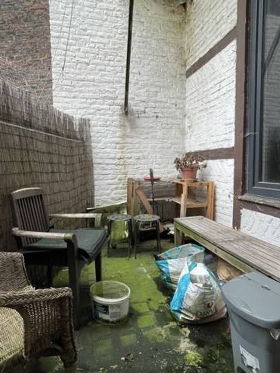 1er étage: un studio comprenant un salon (3.4x3.15), une cuisine (3.1x2.1) et une chambre (3.7x2.15). A l’entresol, une salle de douches avec wc (2.4x2.1) et l’accès à une terrasse (2.75x1.85);