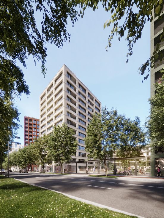 Tussen het KBC hoofdkantoor en Tour & Taxis wordt een volledig nieuw woonproject opgetrokken dat bestaat uit drie hoge gebouwen en één laag gebouw en rustige binnentuin.