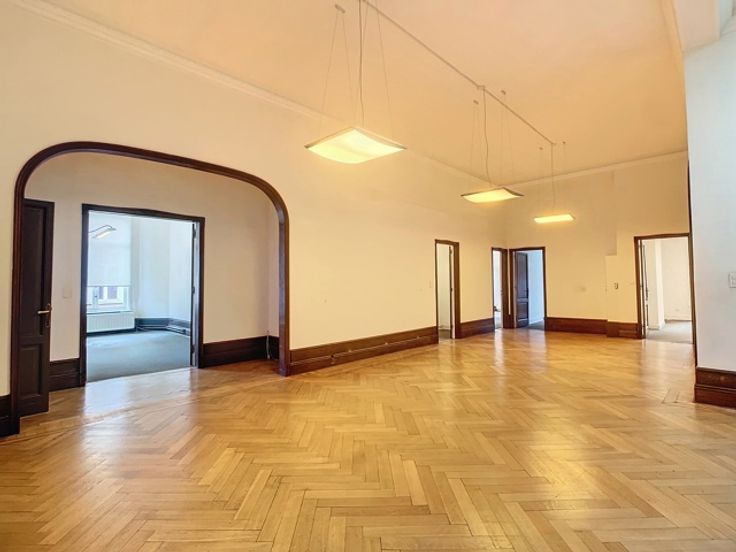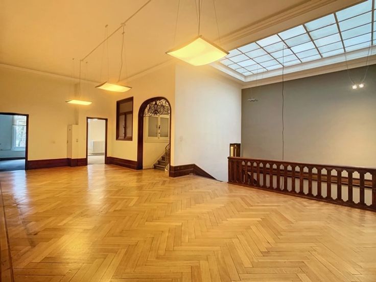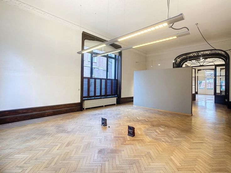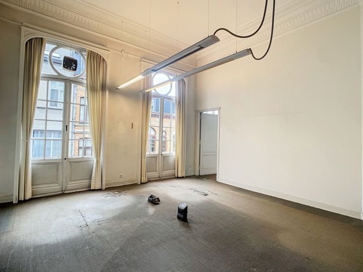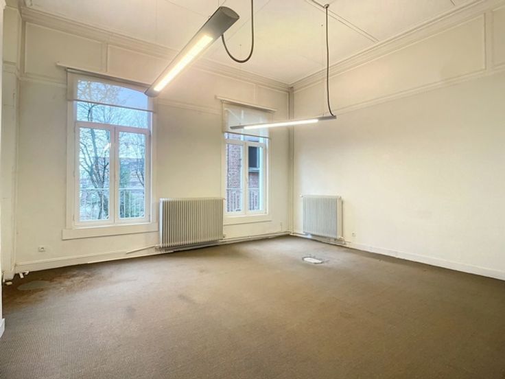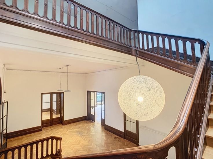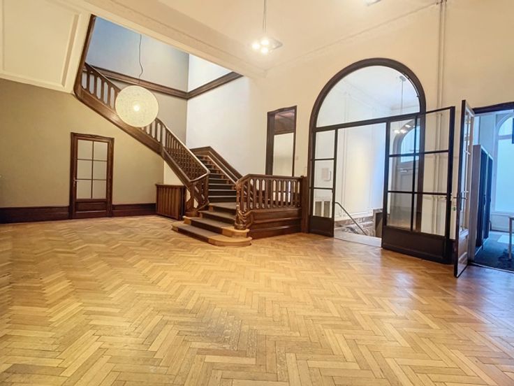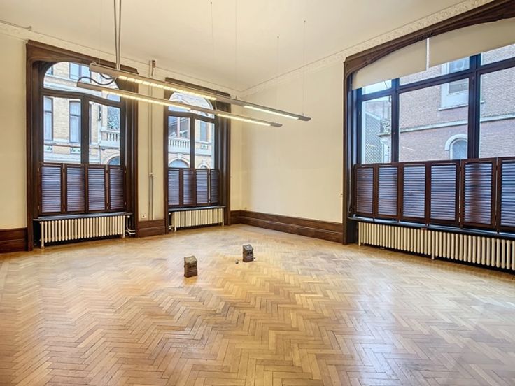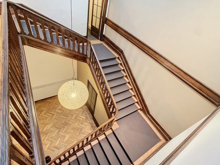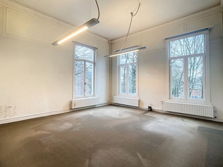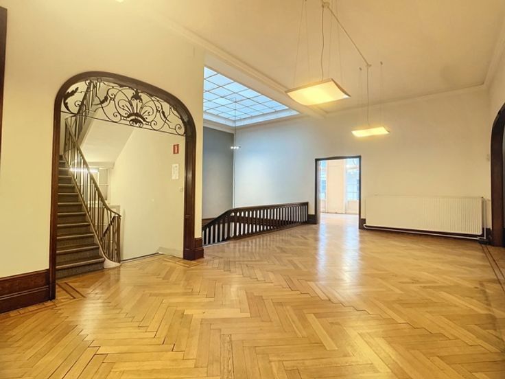 Een centrale trapzaal leidt naar verschillende verdiepingen, elk voorzien van meerdere kantoorruimtes met sanitaire voorzieningen. De totale oppervlakte van 1.800m² omvat 370m² kelderverdieping, 370m² kantoorruimte op de gelijkvloerse verdieping, 370m² op de eerste verdieping en 345m² op de tweede verdieping, alsook 345m² op de zolderverdieping.