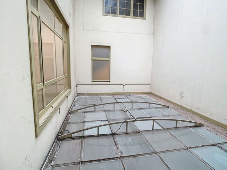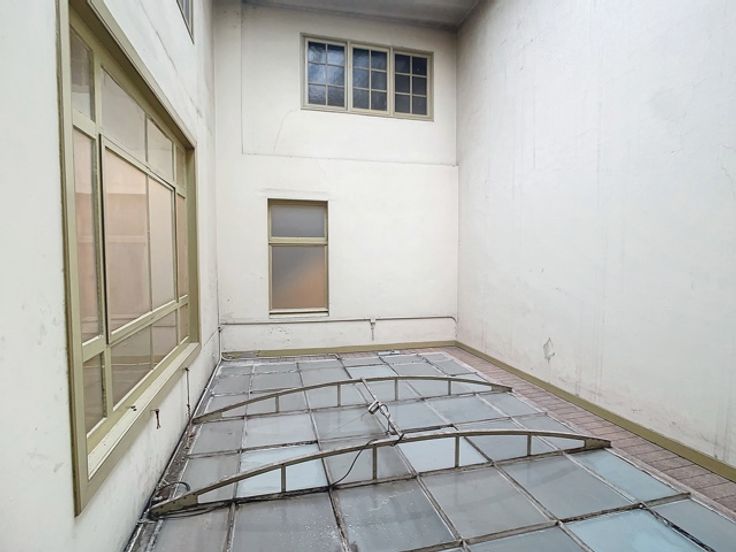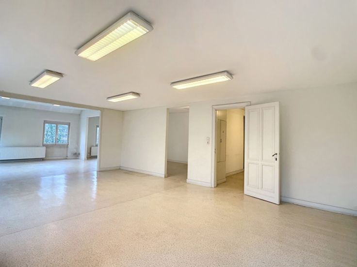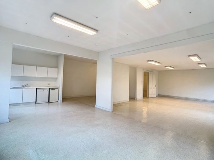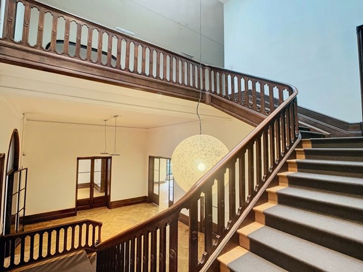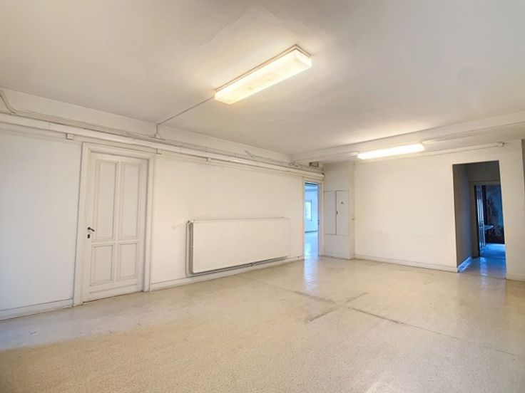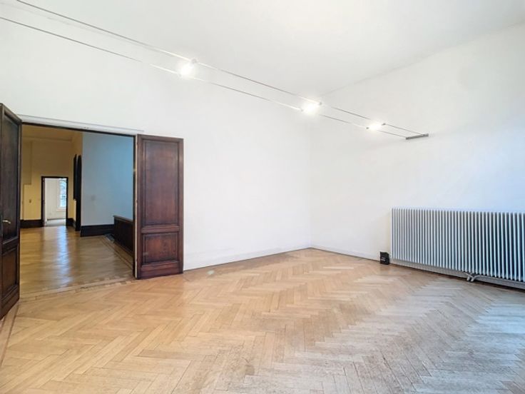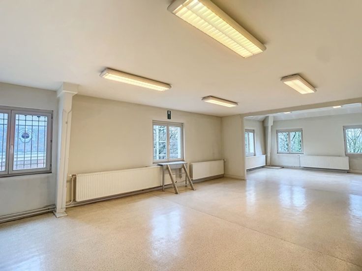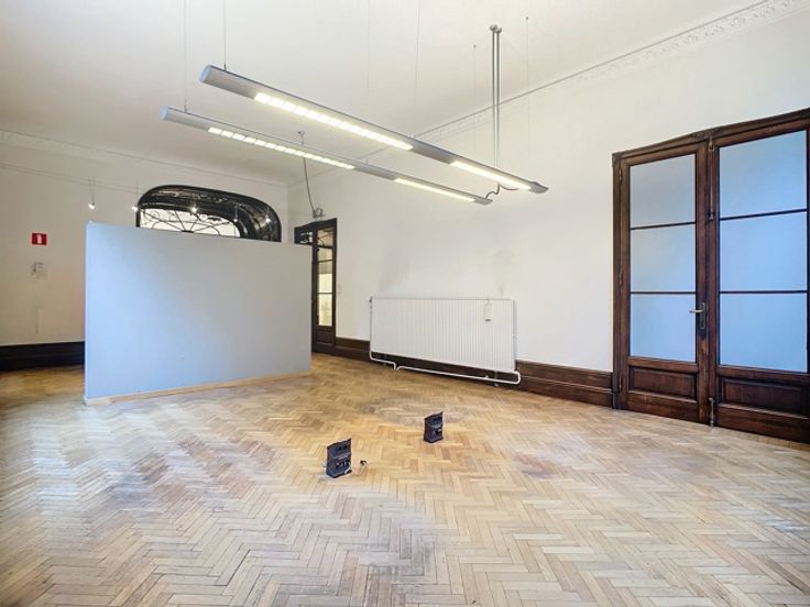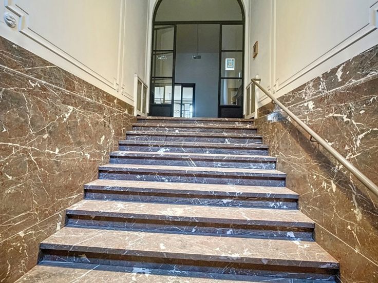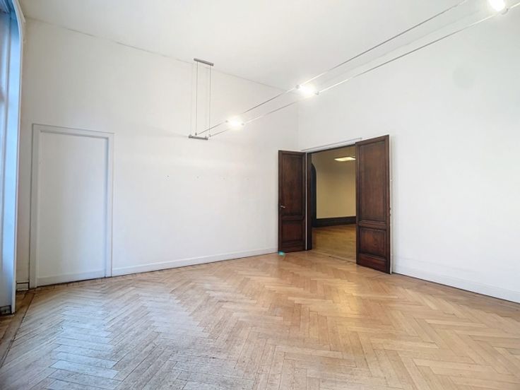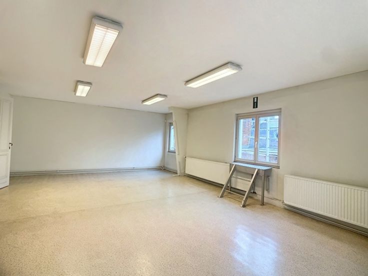 Een centrale trapzaal leidt naar verschillende verdiepingen, elk voorzien van meerdere kantoorruimtes met sanitaire voorzieningen. De totale oppervlakte van 1.800m² omvat 370m² kelderverdieping, 370m² kantoorruimte op de gelijkvloerse verdieping, 370m² op de eerste verdieping en 345m² op de tweede verdieping, alsook 345m² op de zolderverdieping.
