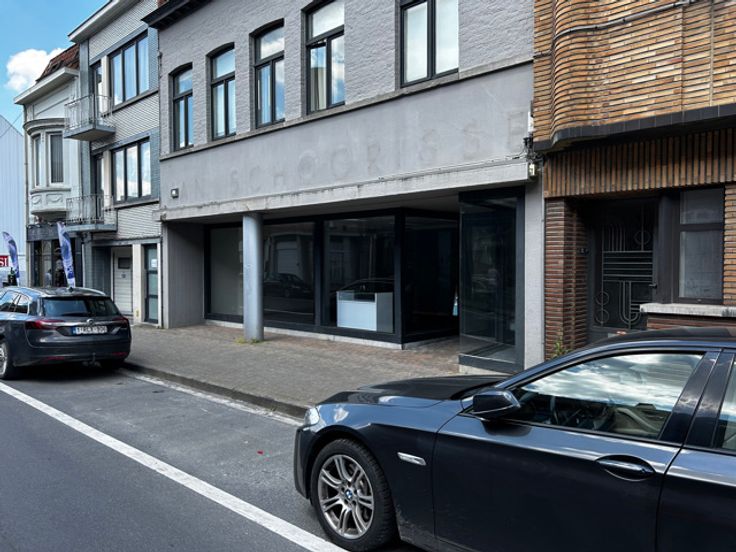 Handelsruimte met grote vitrines pal in het centrum met veel parkeergelegenheid rondom rond.