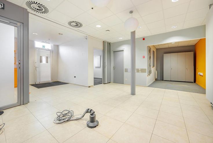 Het pand heeft een grote commerciële/kantoorruimte die als volgt is samengesteld: 21m² receptie, 25m² open ruimte, 4 kantoren variërend van 8,5m² tot 11m², een vergaderruimte van 17m², keuken, heren- en gescheiden damesruimte, opruiming.
