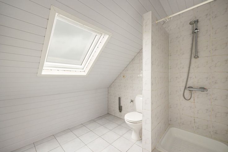 Badkamer op tegel voorzien van douche, lavabo en toilet.