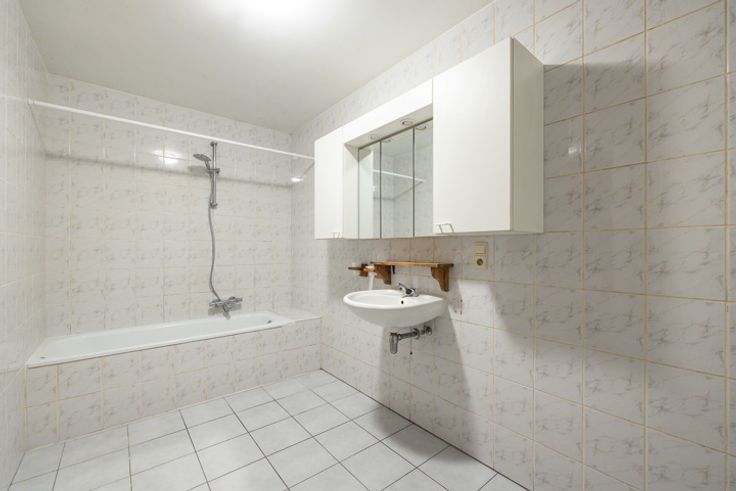 Badkamer op tegel voorzien van bad en lavabo