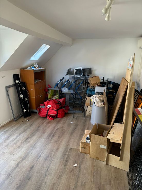 Au rez-de-chaussée très grande surface bien lumineuse, espace de rangement à l'étage de plus ou moins 46m2, un grand jardin de plus ou moins 200m2.