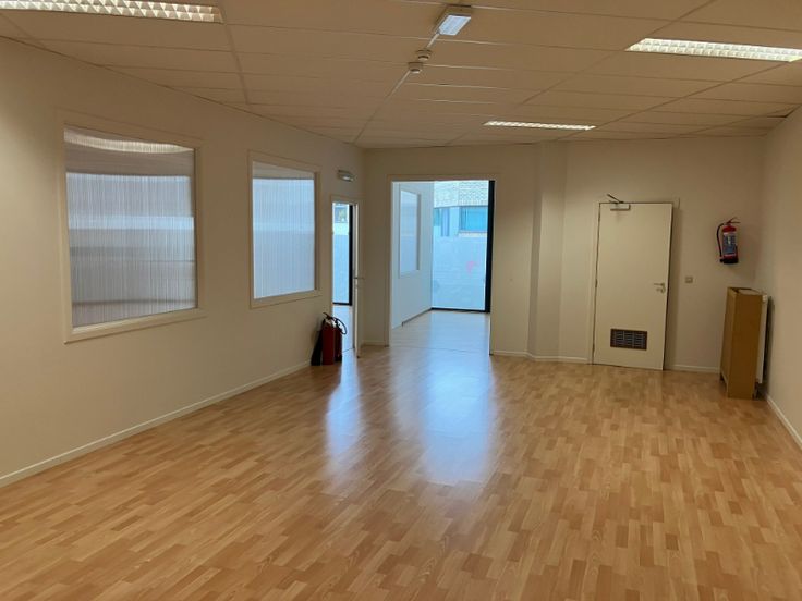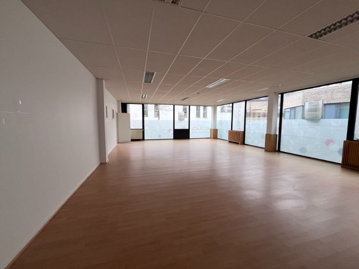 De grote raampartijen aan de voorzijde zorgen voor veel natuurlijk licht en een goede visibiliteit. Met twee aparte inkomdeuren is er ook de mogelijkheid tot het scheiden van verschillende functies binnen het pand.
