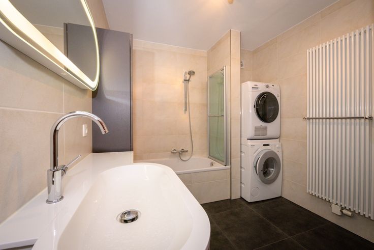 Verder in de hal een aparte toiletruimte, daarnaast de badkamer met lavabomeubel, douche in bad, aansluiting voor wasmachine en droogkast. Aan het einde van de gang aan weerskanten de slaapkamers met laminaat vloerbekleding.