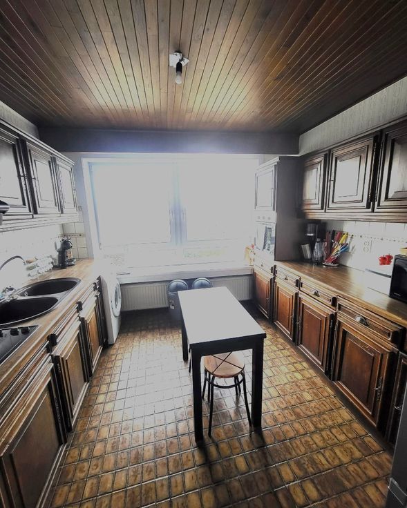 Uiterst aangenaam appartement met ondergrondse autostaanplaats. Indeling : inkomhall 7m² - woonkamer/eetkamer 38m² - wc - keuken 11m² - berging 3m² - 2 slaapkamers 12/15m² - badkamer met bad (douche) lavabomeubel 5m². De keuken en badkamer dienen gerenoveerd te worden. Terras van 12m² (achteraan). Ondergrondse autostaanplaats.