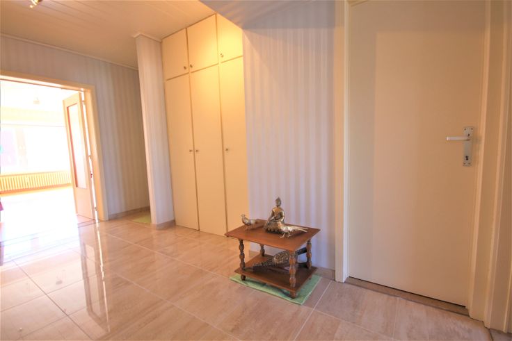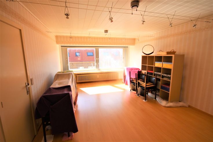 Ruime inkomhall met parlofoon en vestiairekasten),- lichtrijke living (6,25 x 4,11) met prachtige openhaard (in natuursteen),- vernieuwde keuken (4,43 x 2,62) met witte keukenblok + dubbele inox afwasbak (nieuwe tegelwand),- berging met zekeringskast),- toilet ,- badkamer (2,66 x 1,69) met ligbad, toiletmeubel + ingebouwde lavabo, spiegelkast, en hangkast),- bureau (3,18 x 1,79) met dressingskasten en terrasdeur),- master-bedroom (4,95 x 2,23) met dressingskasten),- 2de slaapkamer (4,75 x 2,65) met dressingskasten),- mooie terras (8,50 x 0,60),- Garage nr. 1 (gelijkvloers ter optie).