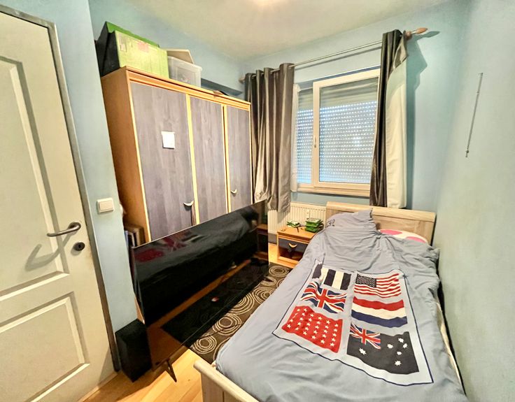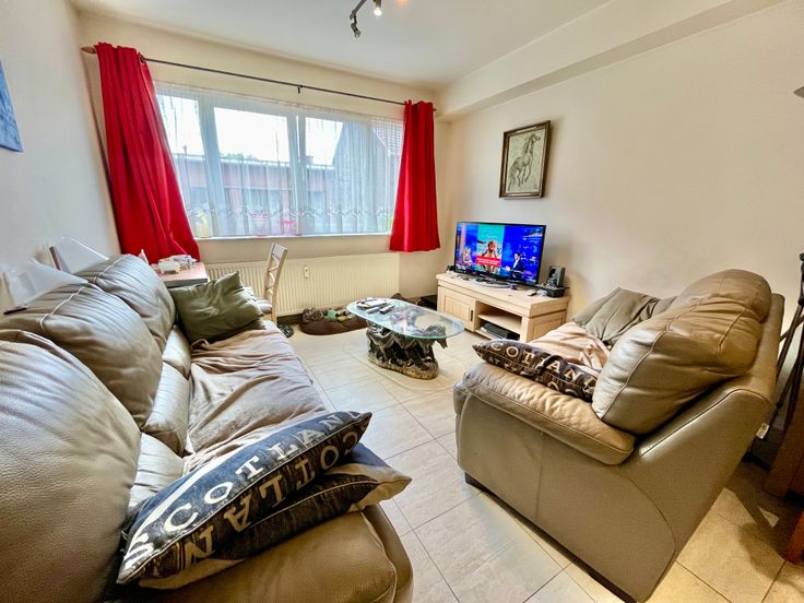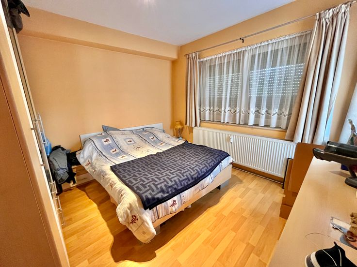 L'appartement se compose d'une pièce de vie ( salon/salle à manger) de +- 25 m2, d'une cuisine équipé avec un petit balcon, un hall de nuit dessert 2 chambres ( 12,5 et 8,5 m2) dont une avec un agréable balcon, une salle de douches récente, un wc séparé et un espace de rangement.