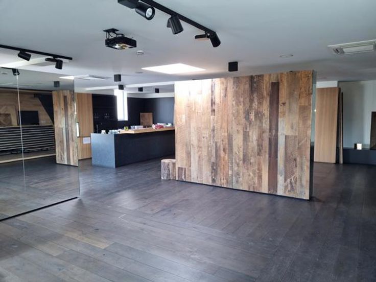 - verdiep: grote open showroom met recente keuken en maatwerkmeubilair, airco, sanitair en bergruimte