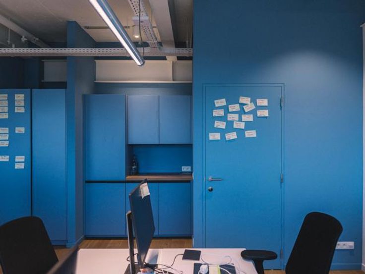 - Bemeubelde kantoren: bureau, ergonomische stoel, ladeblok en opbergkast, allemaal Kinnarps