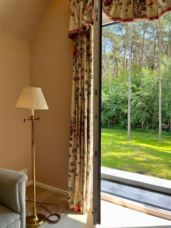 Exterieur: bosrijke tuin grenzend aan het bos, terrassen.