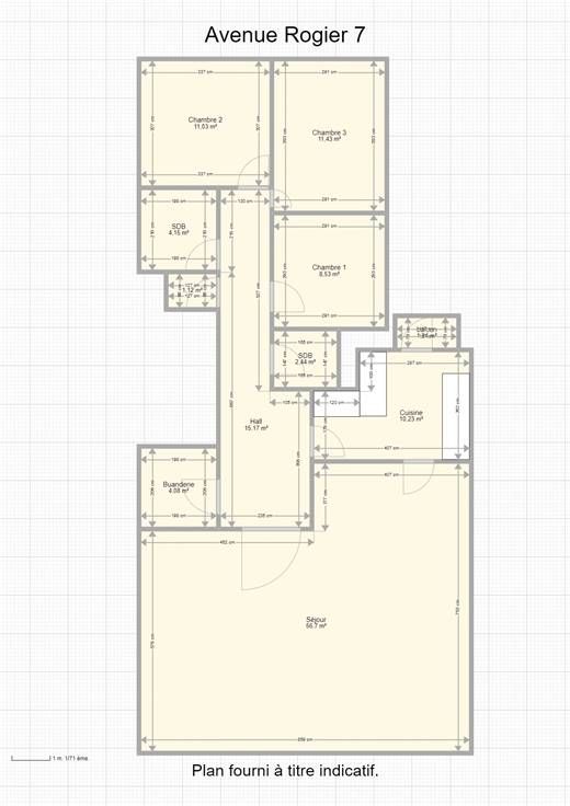 Sorry er is geen nederlandse vertaling beschikbaar. Très bel appartement trois chambres de 140 m² situé au 3ème étage, il comprend : un hall d'entrée 2.10x3.70, un vaste séjour (salon, salle à manger) 4.10x7.50+4.45x5.80, un débarras 2.00x2.15, une cuisine équipée (taque vitro céramique, hotte, évier, four, lave vaisselle, frigo) 3.30x4.10 avec un balcon 1.80x1.10, emplacement prévu lave-linge et séchoir, un hall avec placards, une toilette avec lavabo 1.45x0.80, trois chambres dont deux avec placard de 3.00x3.00, 3.00x3.60 et 3.00x4.50 et une avec salle de douche (douche, lavabo) 1.70x1.40, une salle de bains (baignoire, lavabo et toilette) 2.00x1.90, une cave.