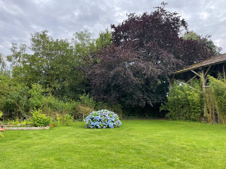 Jardin arrière plat exposé plein sud équipé d'un robot tondeuse.