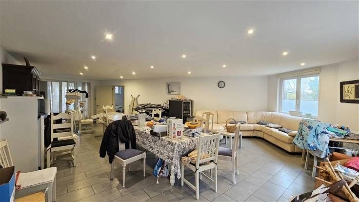 Rez: Hall d'entrée, living, cuisine séjour meublée, salle de douche/WC, grande remise actuellement aménagée en salle de réception familiale, terrasse, jardin, garage une voiture.