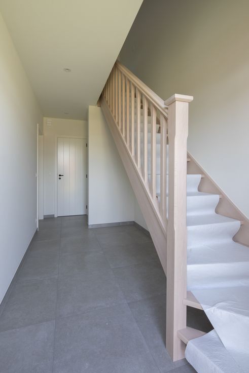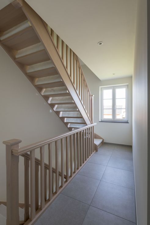 De woning omvat een ruime leefruimte, kwalitatieve Leicht keuken met Siemens apparatuur, inkomhal en nachthal met eerste keus houten trappen, een ruime garage voorzien van een geautomatiseerde geïsoleerde sectionaalpoort en een gastentoilet op het gelijkvloers.