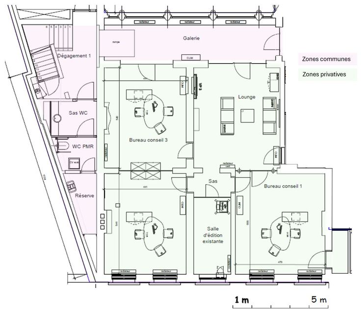 Il se compose de 6 pièces dont 1 salle d’attente / zone commune qui peut servir également de bureau, 1 hall, 3 bureaux et 1 réduit de rangement. Sanitaires communs avec 2 autres bureaux.