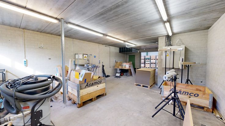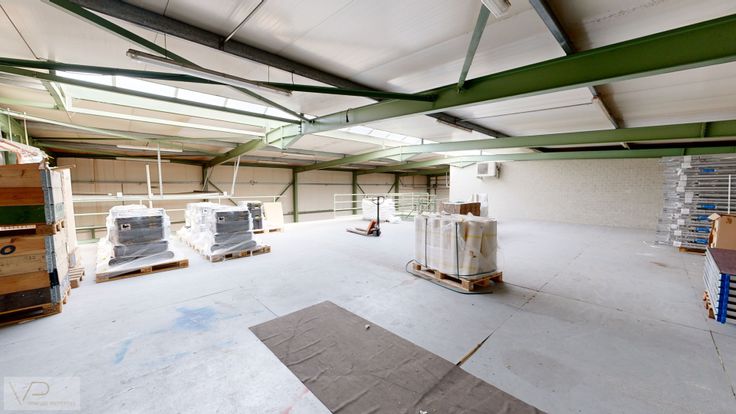 Magazijn: Het magazijn heeft een royale oppervlakte van 830m2 in staal structuur en biedt een vrije hoogte van 7 meter. Deze ruimte is ideaal voor diverse bedrijfsactiviteiten en opslag.