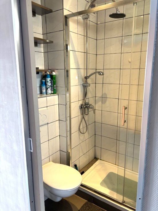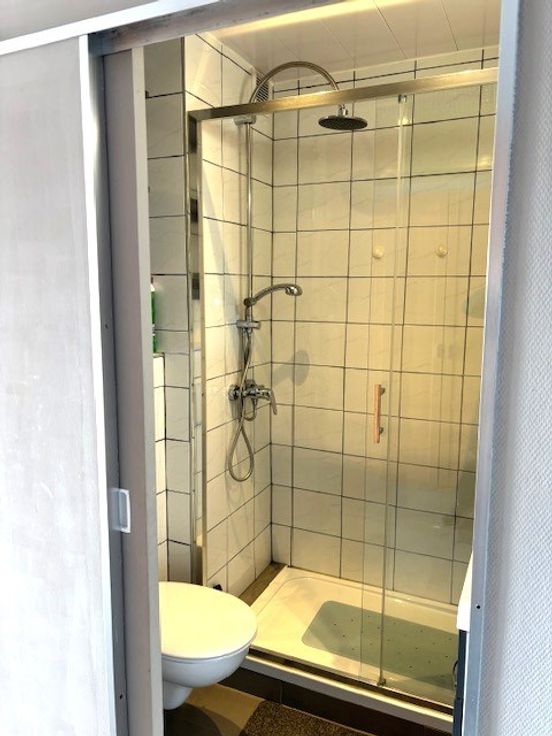 Badkamer met toilet, douche en wastafel. Groot kastbed voor 2 personen.