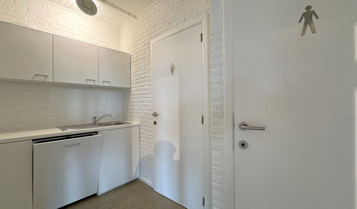 Indeling kantoor: deels landscape- deels ingedeelde kantoorruimte met kitchenette met toestellen, aparte vergaderzaal en privatief sanitair
