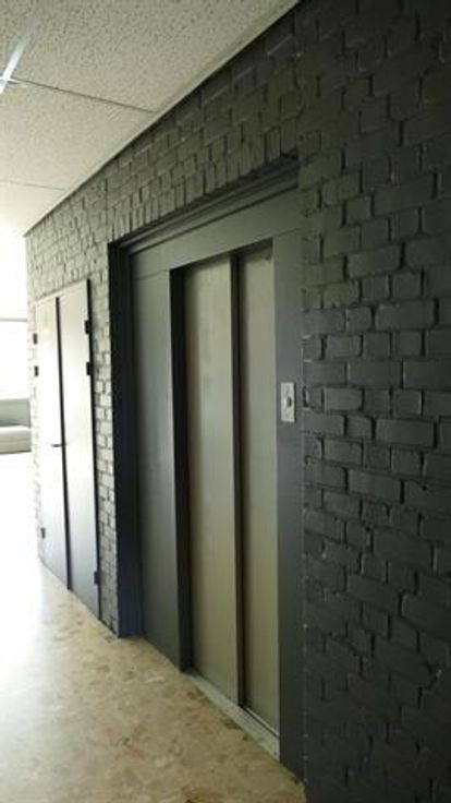 Beveiligde hal met lift en trap naar de kelder en de bovenverdiepingen.
