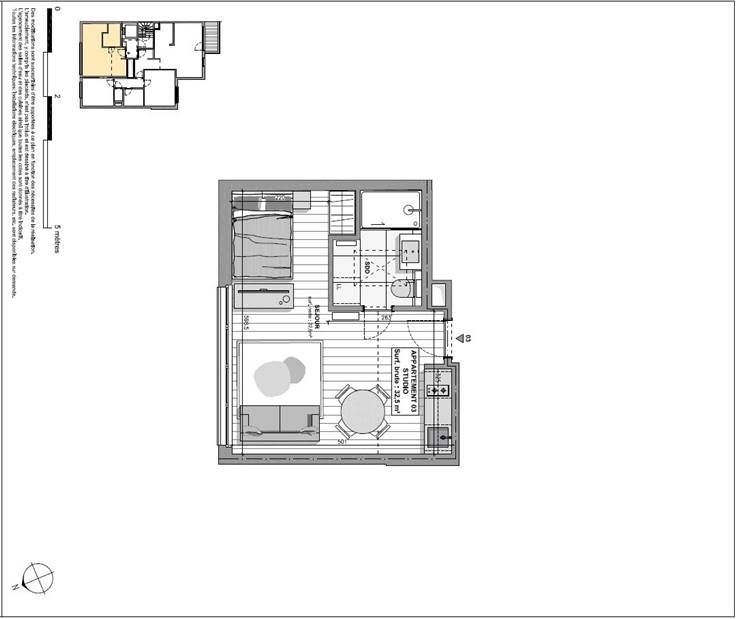 Heldere woon-keuken ruimte van ongeveer 23 m² met slaapgedeelte en ruimte voor een garderobe, uitgeruste keuken, douchekamer met WC en ruimte voor een wasmachine.