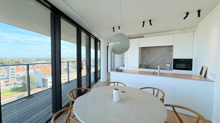 Nieuwbouw appartement op de 7de verdieping genietend van panoramische zichten gelegen in de exclusieve residentie "The Tower" te Duinenwater. Indeling: inkomhal met vestiaire en gastentoilet. Ruime woonkamer met riante raampartijen die uitzonderlijke zichten geven over Knokke. Woonkamer met salon, eetplaats en volledig ingerichte open keuken met keukentoestellen van Miele. De leefruimte geeft uit op een ruim terras rondom het appartement die geniet van panoramische zichten over Knokke. Eerste slaapkamer met ensuite badkamer met ligbad, dubbele lavabo en toilet. 2de ruime slaapkamer met badkamer met ligbad en dubbele lavabo. 3de ruime slaapkamer met douchekamer voorzien van inloopdouche en lavabo. Alle slaapkamers hebben ingemaakte kasten en toegang tot het buitenterras. Praktische berging met aansluiting voor wasmachine en droogkast. Privatieve kelder en fietsenstalling in de residentie. Mogelijkheid tot aankoop van een autostaanplaats in de ondergrondse garage van de residentie. Renovatieplicht: nee