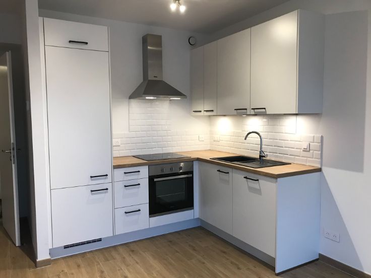 Inkomhal, ingerichte keuken, woonkamer met openslaande deur naar balkon, douchekamer met wastafel en bergkast, WC